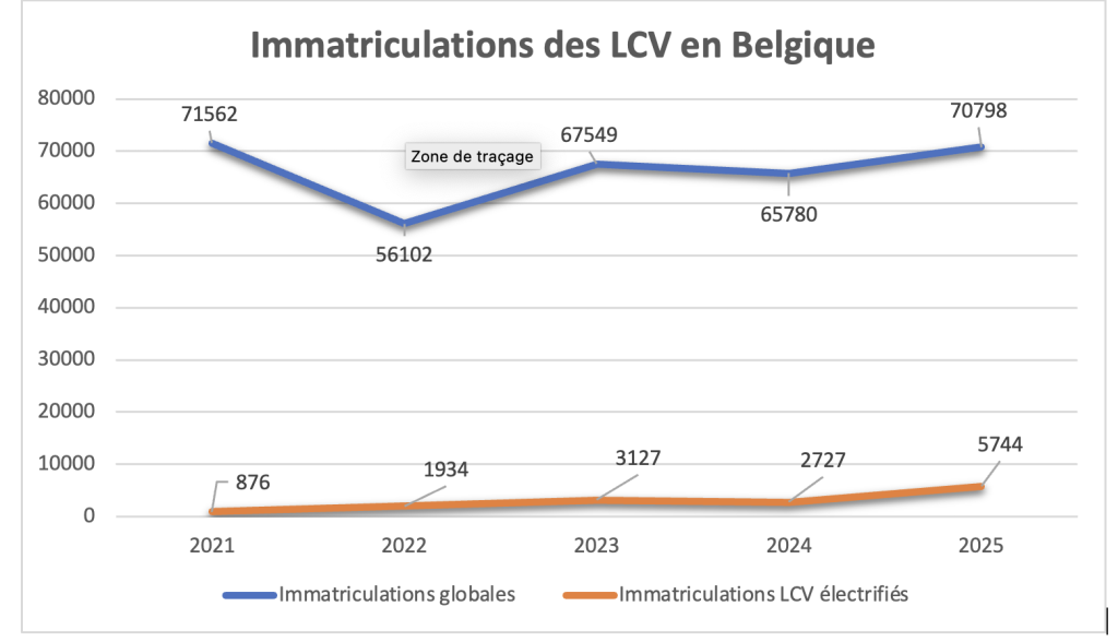 In België heeft de markt voor lichte bedrijfsvoertuigen zich in 2025 hersteld, met 70.798 inschrijvingen, wat neerkomt op een stijging van 7,6%. Dat is bijna opnieuw het niveau van 2021, na het dieptepunt van 2022 dat werd veroorzaakt door marktverstoringen. Op het vlak van elektrificatie is er wel degelijk vooruitgang, maar België blijft achter bij het Europese gemiddelde. Oplaadbare lichte bedrijfsvoertuigen, dat wil zeggen volledig elektrische en oplaadbare hybridemodellen, waren vorig jaar goed voor 8,1% van de Belgische inschrijvingen, tegenover gemiddeld 11,2% in de Europese Unie. De ontwikkeling versnelt echter aanzienlijk, aangezien dit aandeel in 2024 nog slechts 4,1% bedroeg.