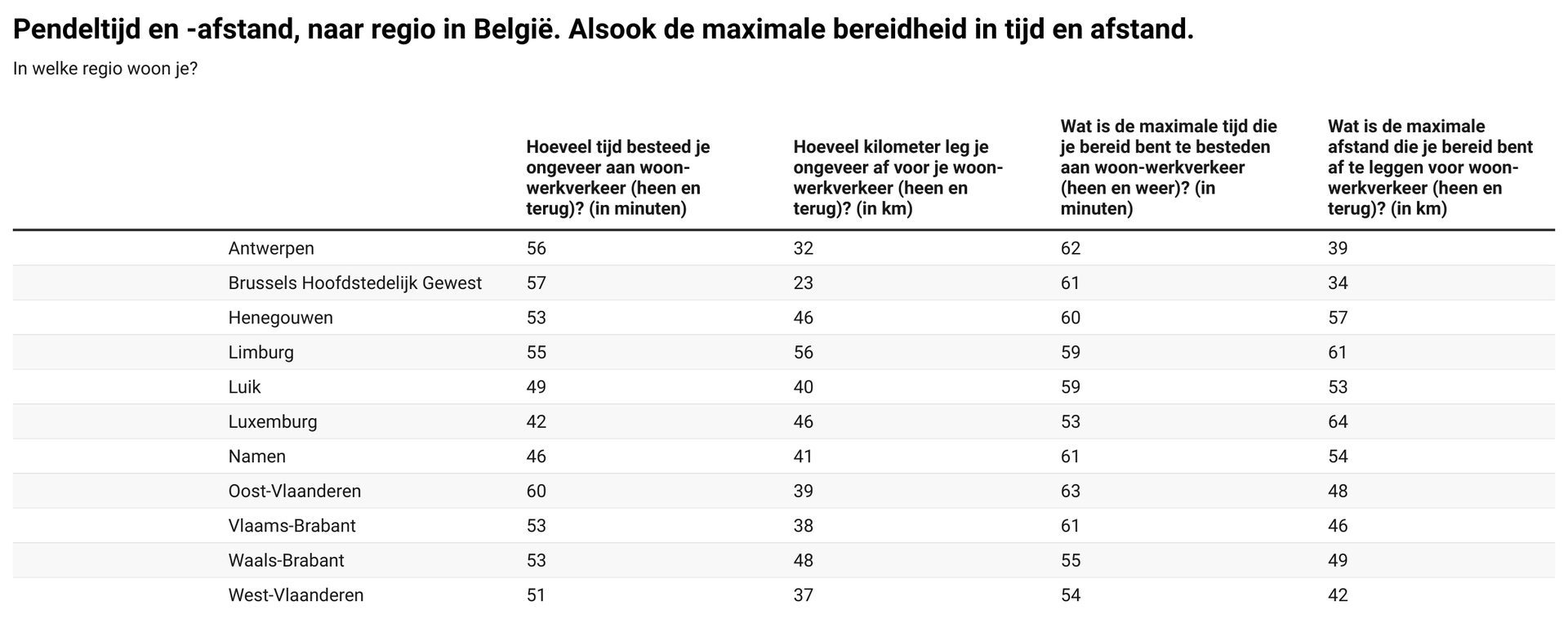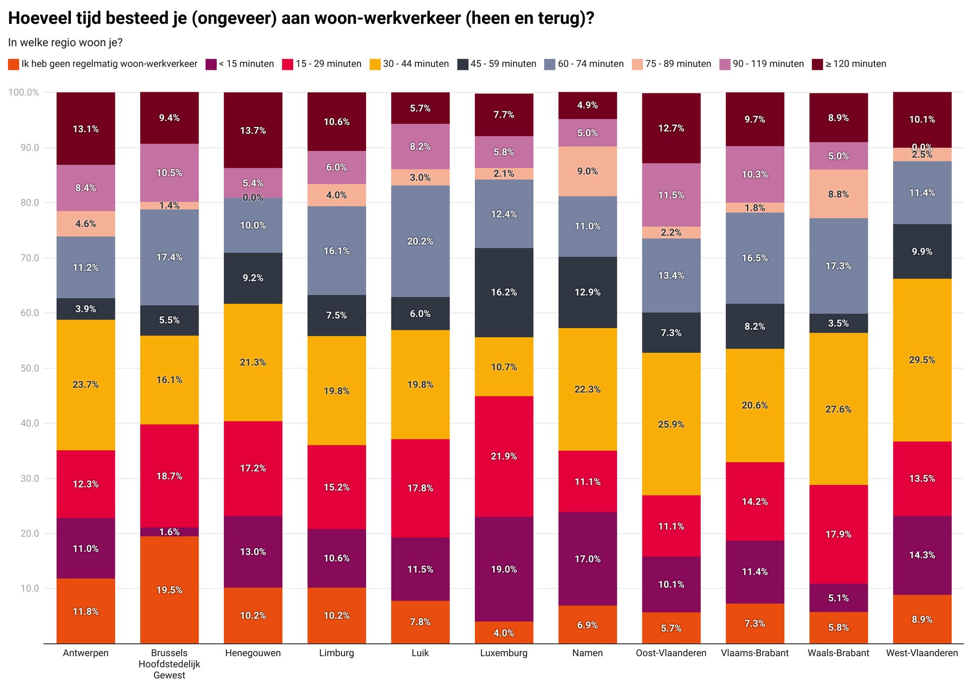 Belgen zijn Europees kampioen woon-werkverkeer. Grosso modo kan je zeggen dat onze mentale grens op 60 minuten woon-werkverkeer per dag ligt, of een half uur per traject. Inwoners van West-Vlaanderen houden het op maximum 54 minuten of 27 minuten enkel, maar zij werken het meest in eigen provincie.