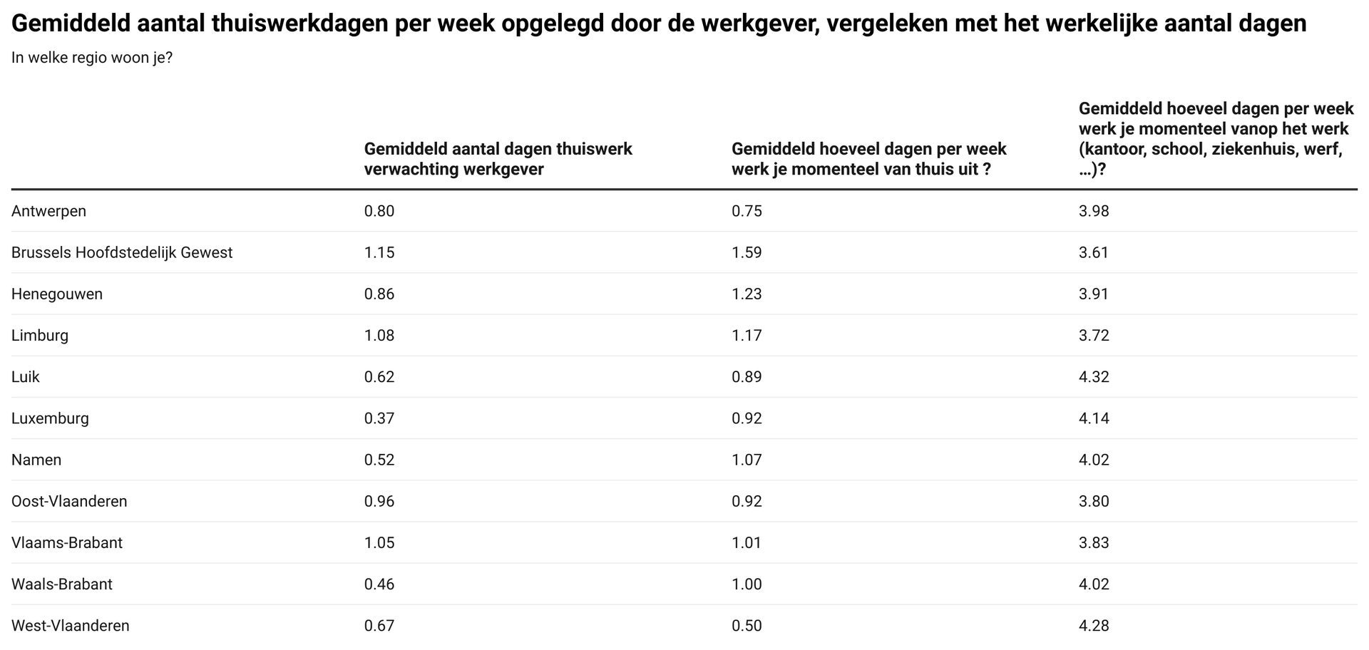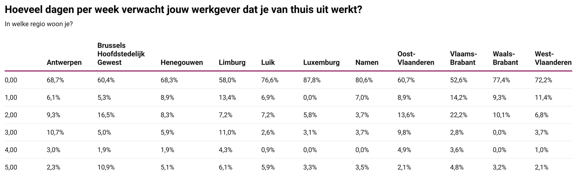 Thuiswerk is het meest aan de orde voor inwoners van Vlaams-Brabant, Limburg, Brussel en Oost-Vlaanderen. Het minst thuiswerk zien we bij wie woont in West-Vlaanderen en Antwerpen.
