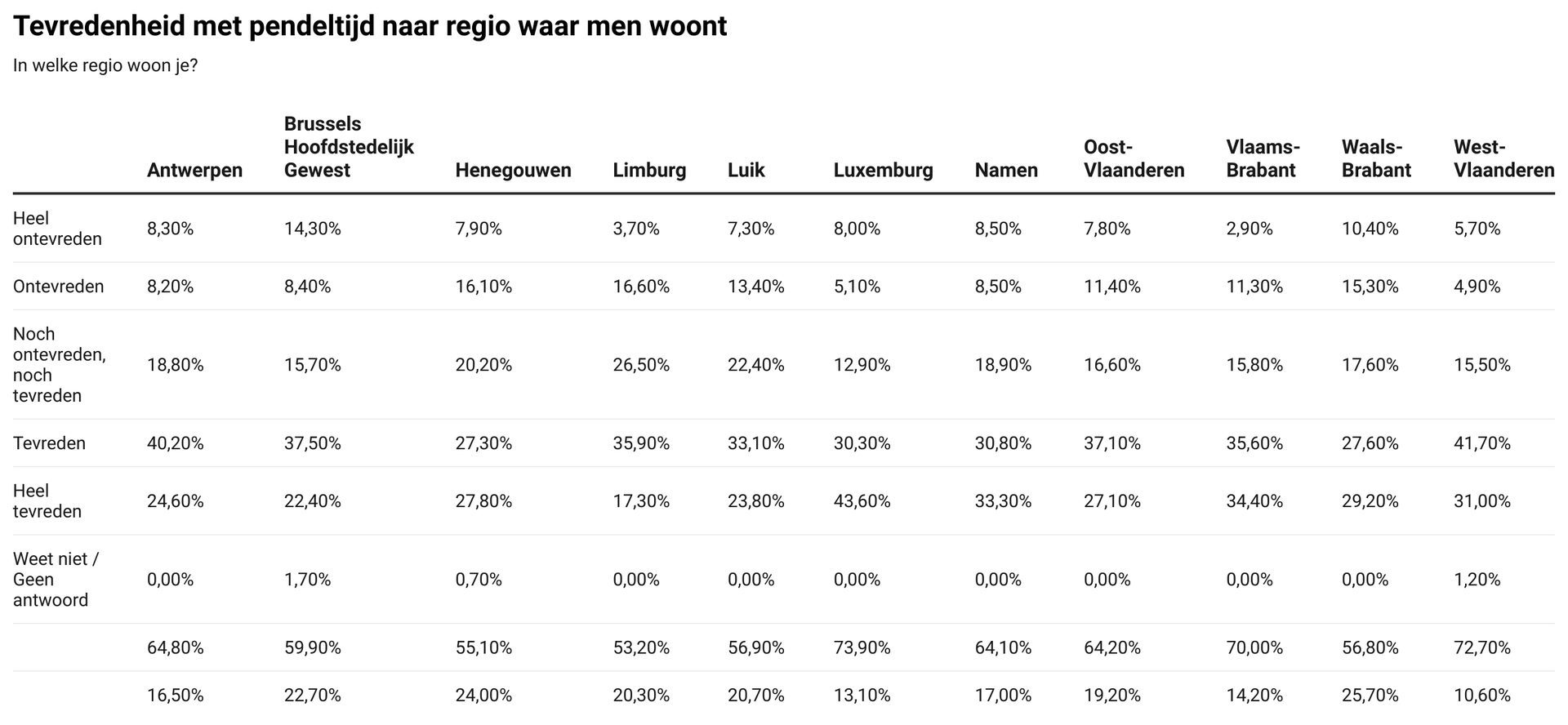 Slechts de helft (53%) van de Limburgers is tevreden met de pendeltijd. Dit is het laagste cijfer in België. Een op vijf Limburgers (of 20%) is ontevreden. In Limburg ervaart 41% van de inwoners het woon-werktraject als tijdverspilling. Toch kennen zij de hoogste bereidheid om zich te verplaatsen voor het werk. Zo zijn inwoners in Limburg bereid 61 kilometer heen en terug te rijden, als het maar niet langer duurt dan een uur (59 minuten) heen en terug; met een gemiddelde effectieve tijd van 55 minuten per dag zitten velen tegen hun grens aan. Een op zes (17%) doet er langer over dan anderhalf uur. Zo goed als vier op de tien (37%) Limburger spenderen meer dan een uur aan hun woon-werkverkeer.