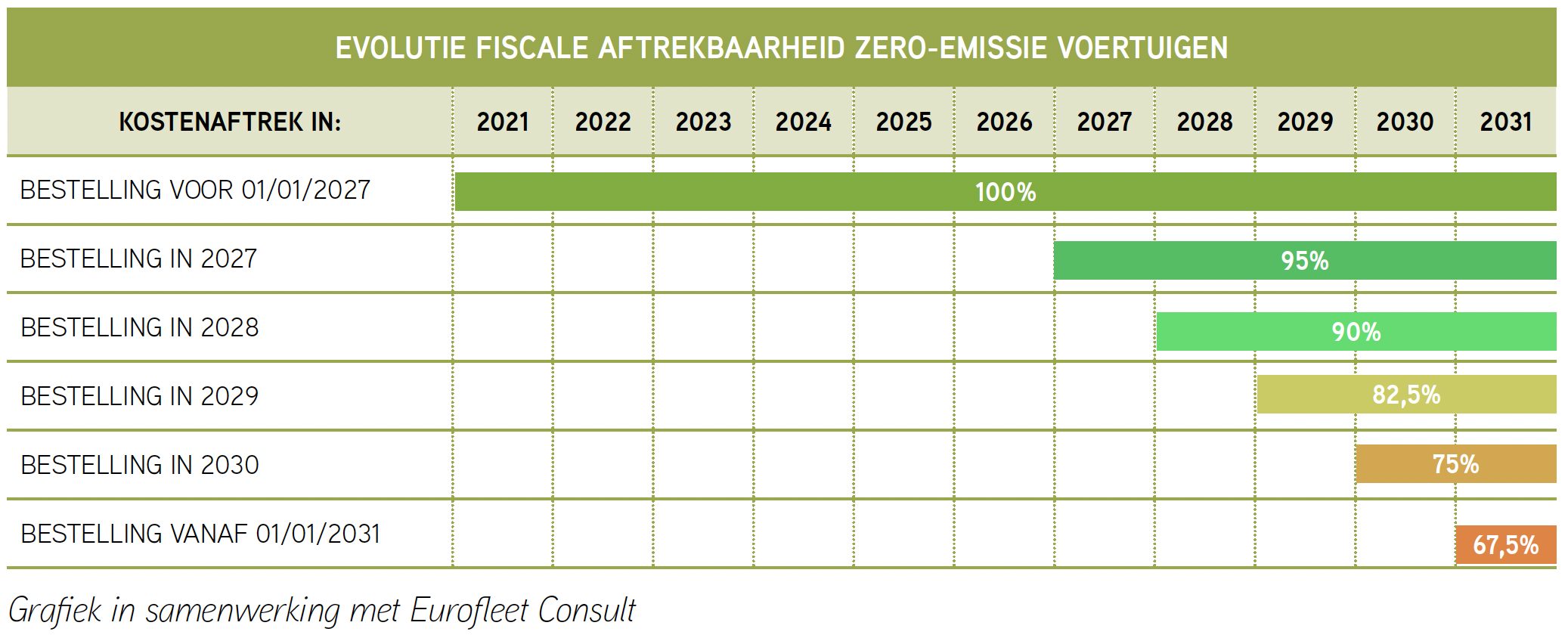 Het principe van variabele fiscale aftrekbaarheid geldt niet voor zero-emissie voertuigen. Eenmaal besteld in een bepaald jaar behouden zij hun fiscale aftrekbaarheid gedurende de volledige looptijd. Wie een 100% elektrisch voertuig bestelt in 2025, zal de 100% aftrekbaarheid behouden voor de volledige looptijd of gebruiksduur.