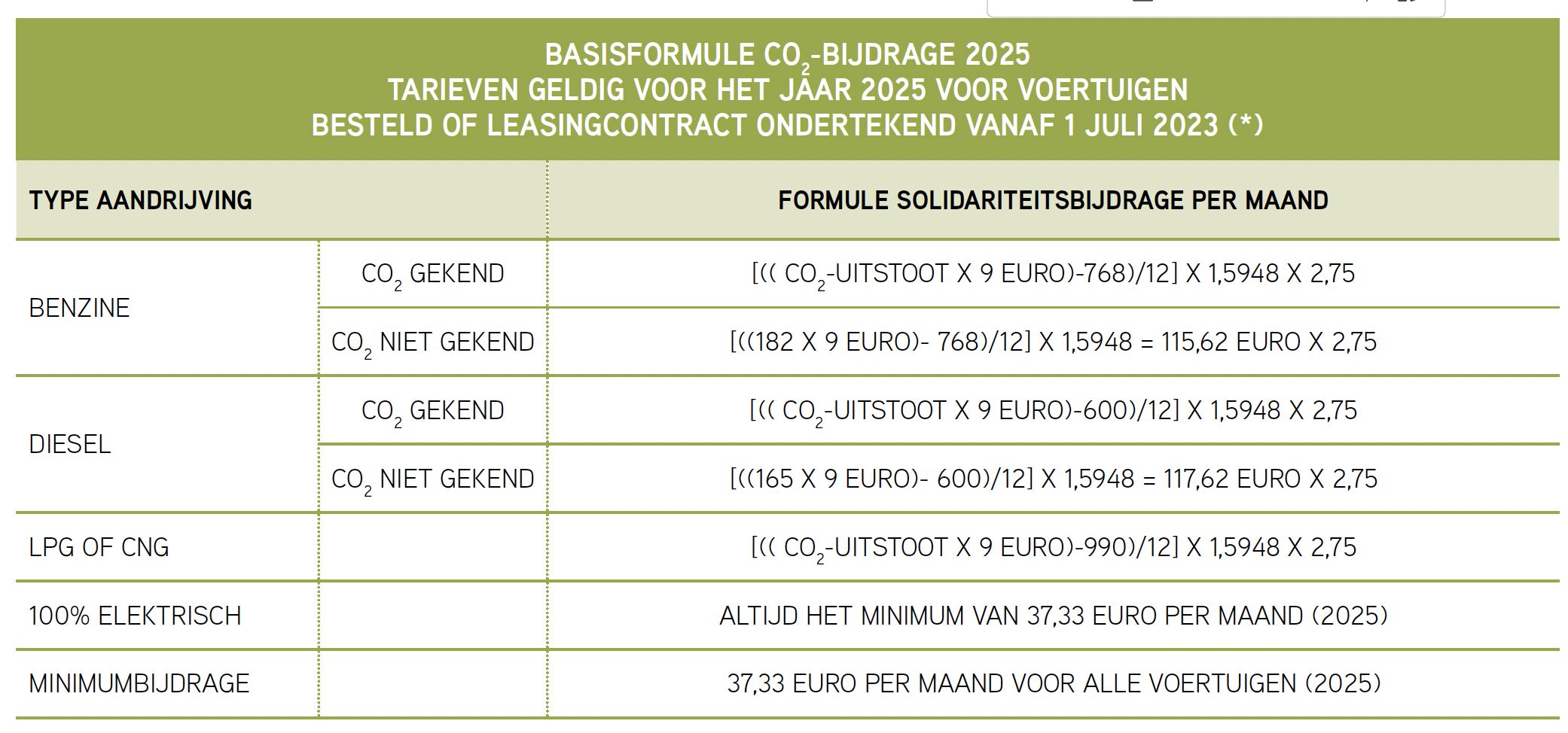 2) Voor alle voertuigen inclusief PHEV’s en zero-emissievoertuigen besteld vanaf 1 juli 2023 of leasingcontracten ondertekend vanaf 1 juli 2023: Het niet geïndexeerd bedrag stijgt ingevolge de wetgeving vergroening van bedrijfswagens (Wet van Peteghem) van 20,83 euro naar 23,41 euro per maand. Na indexatie stijgt het maandelijkse minimumbedrag van 31,99 euro naar 37,33 euro per voor het jaar 2025. Dit is een stijging van 16,69%!