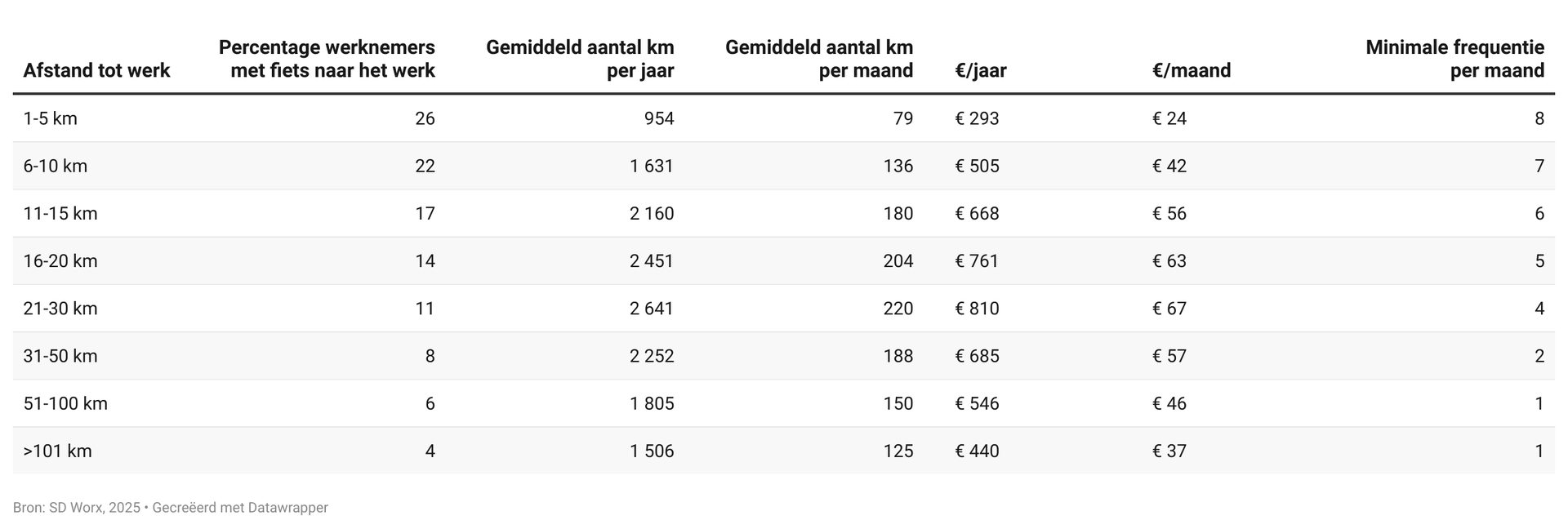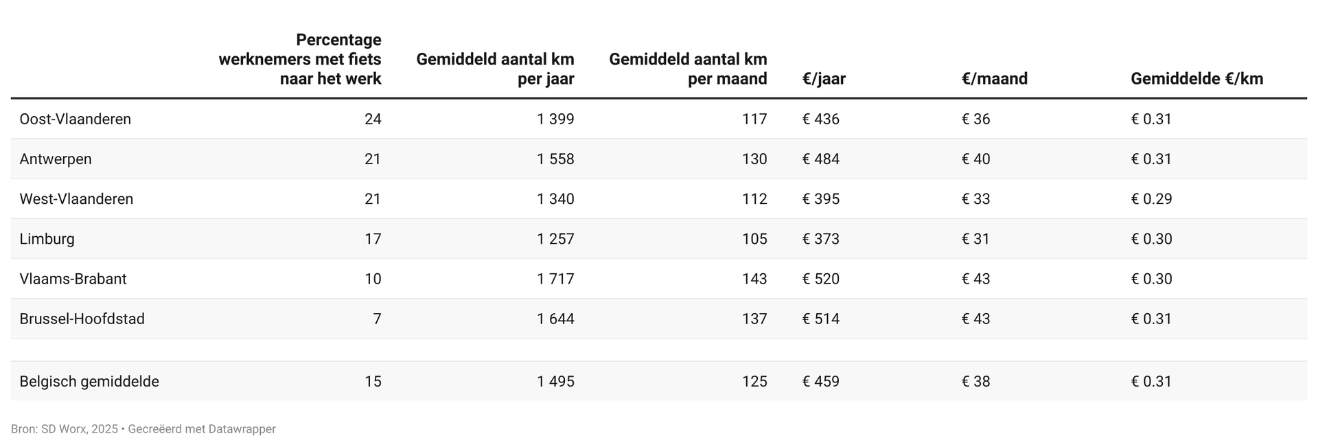 Gemiddeld brengt fietsen naar het werk de werknemer 460 euro netto per jaar op. Dat berekent SD Worx op basis van het geregistreerd woon-werkverkeer met de fiets van meer dan 150.000 werknemers op een totaal van 1,2 miljoen werknemers in de privésector in 2024. Het bedrag is afhankelijk van de frequentie, de afstand tot het werk en de vergoeding per kilometer. Eén op zes Vlamingen neemt de fiets voor woon-werkverkeer. Wie de fiets nam, deed dat wel vaker: gemiddeld over het jaar bijna tien procent meer fietskilometers (9%). Fietsen naar het werk is het meest populair in Oost-Vlaanderen: een op vijf werknemers neemt geregeld de fiets voor het woon-werkverkeer. In Vlaams-Brabant leggen de werknemers gemiddeld de meeste kilometers af. Sinds 2024 is het maximaal vrijgesteld bedrag van de fietsvergoeding verhoogd naar 35 eurocent per kilometer.