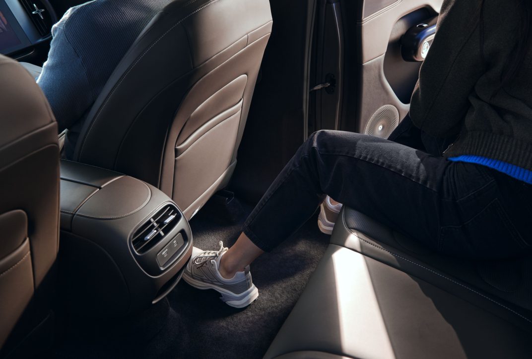 We wisten al dat de #5 een flinke wielbasis van 2,90 meter heeft, en tijdens de statische presentatie in Stuttgart konden we inderdaad vaststellen dat er aan binnenruimte geen gebrek is, ook niet achterin, temeer omdat je ook nog eens je voeten onder de voorstoelen kunt schuiven, al is er zoveel beenruimte dat dat voor de meeste mensen niet nodig zal zijn.